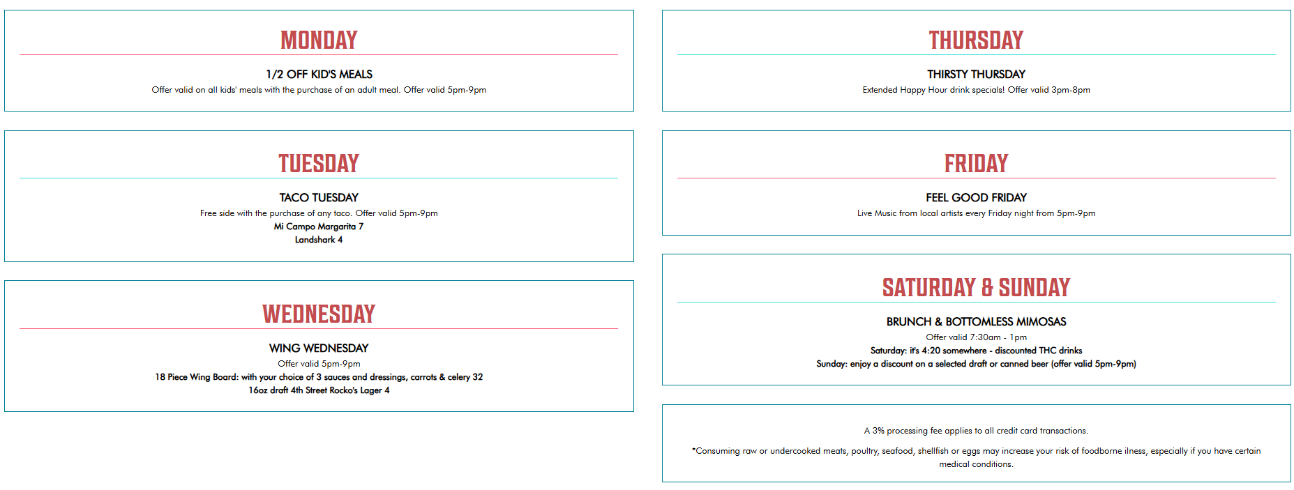 Take advantage of weekday happy hour from 3PM–6PM and explore rotating daily specials that make every visit unique.