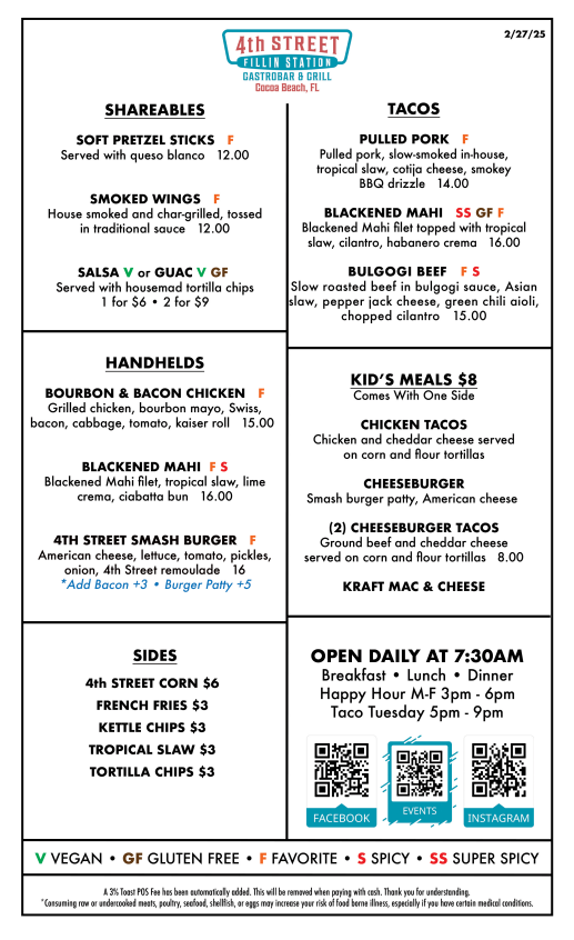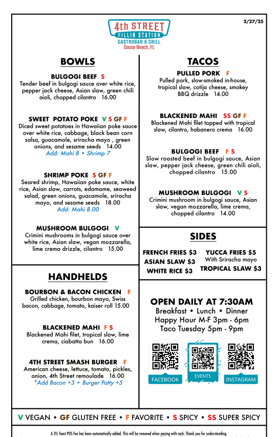4th Street Fillin Station is a lively gastrobar and grill serving elevated comfort food in the heart of Cocoa Beach. Known for creative dishes, craft drinks, and a welcoming atmosphere, 4th Street Fillin Station is a favorite for locals and visitors alike.