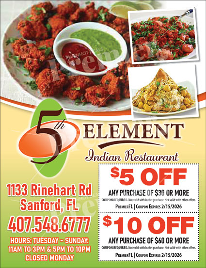 5th Element Indian Restaurant brings the vibrant taste of India to Sanford with a menu full of freshly prepared, authentic dishes. Every meal captures the essence of traditional Indian spices, balancing rich aromas with bold, unforgettable flavors.