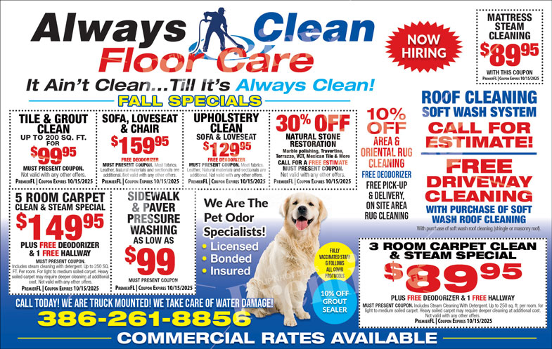 Always Clean Floor Care delivers top-rated carpet, tile, and upholstery cleaning services across Central Florida. Their experienced technicians specialize in stain removal, deodorizing, and sanitizing for both residential and commercial spaces.