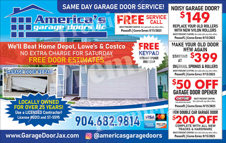 Locally owned for over 25 years, America’s Garage Doors LLC provides fast, affordable, and reliable garage door repairs and installations. They beat competitor prices and never charge extra for Saturday service.