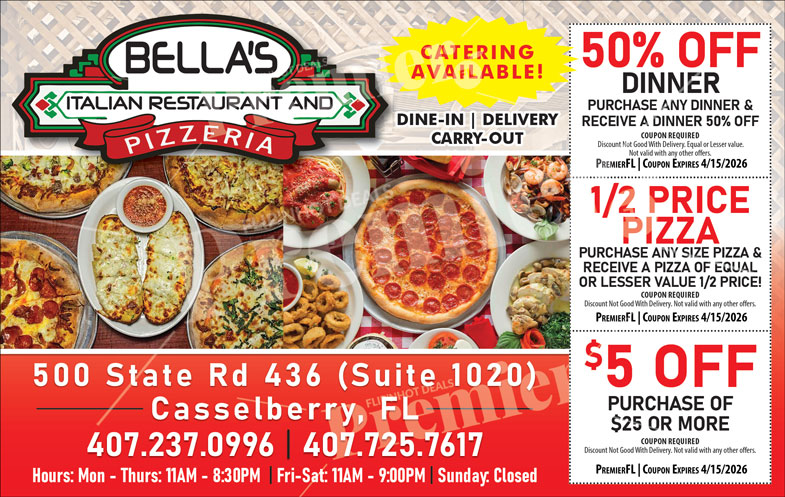 Conveniently located on State Road 436, Bella’s offers dine-in, delivery, and carry-out services. Catering is also available for parties, office events, and special occasions, making it easy to bring authentic Italian flavor to your next gathering.