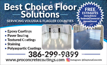 Best Choice Floor Solutions provides professional epoxy coatings and decorative concrete finishes for residential and commercial properties throughout Volusia and Flagler Counties.