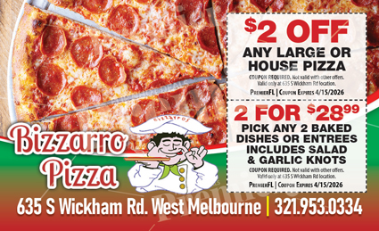 Bizzarro Pizza is a longtime local favorite serving authentic New York–style pizza in West Melbourne, Florida. With over two decades of experience, Bizzarro Pizza is known for its classic recipes, generous portions, and casual atmosphere that keeps families, locals, and pizza lovers coming back.