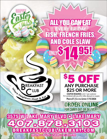 Breakfast Club of Lake Mary is a local favorite serving fresh, made-to-order breakfast and lunch in a friendly, welcoming atmosphere. Known for generous portions and classic comfort food, the restaurant is the perfect spot to start your day in Lake Mary, Florida.
