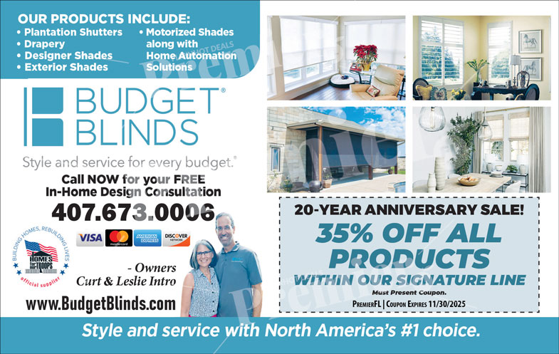 Call 407-673-0006 today to schedule your free in-home design consultation, or visit BudgetBlinds.com to explore their products and design ideas. Experience the perfect combination of custom style, expert service, and unbeatable value with Budget Blinds — North America’s #1 choice in window coverings.