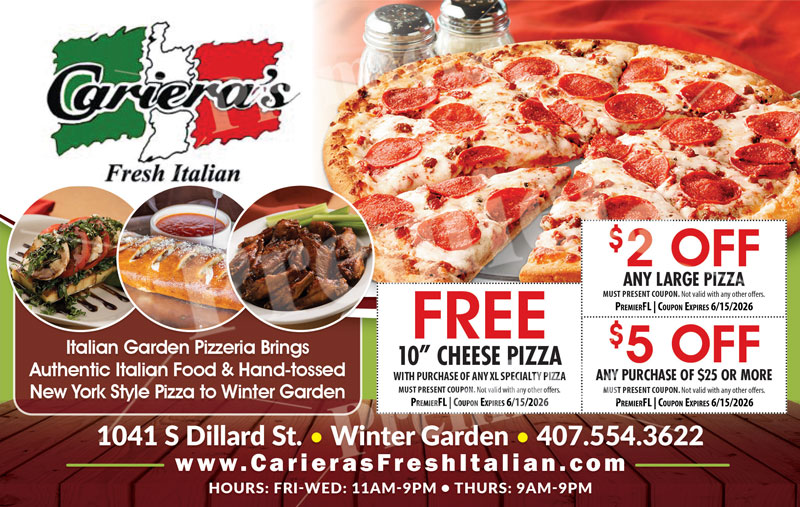 Cariera’s Fresh Italian brings authentic Italian cuisine and hand-tossed New York–style pizza to Winter Garden, Florida. Known for fresh ingredients, traditional family recipes, and generous portions, Cariera’s delivers a true Italian dining experience in a welcoming atmosphere.