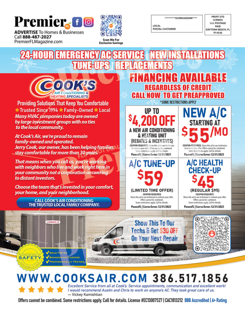 Unlike large corporate HVAC chains, Cook’s is invested in the local community. Their technicians live and work right here in Volusia and Flagler Counties, providing personal attention and trustworthy care. With background-checked and drug-tested technicians, safety and satisfaction are always guaranteed.