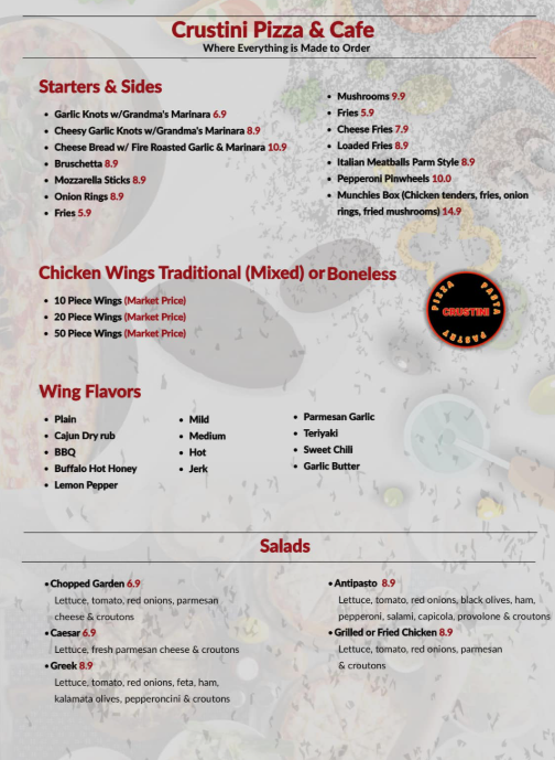 Enjoy unbeatable deals including a free appetizer with qualifying purchase and money-saving pizza specials. Whether you’re dining in or ordering online, Crustini Pizza delivers quality and flavor in every bite.