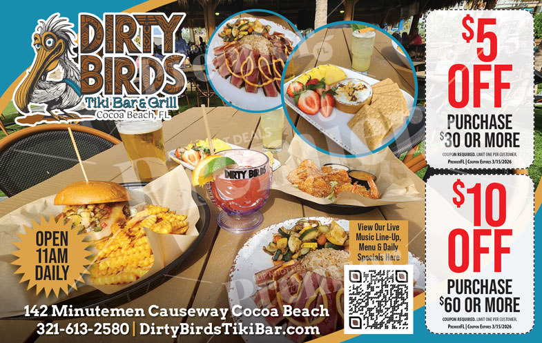 With live music, a welcoming tiki atmosphere, and a convenient Cocoa Beach location, Dirty Birds Tiki Bar & Grill is the perfect place to unwind, enjoy great food, and experience local entertainment just minutes from the beach.