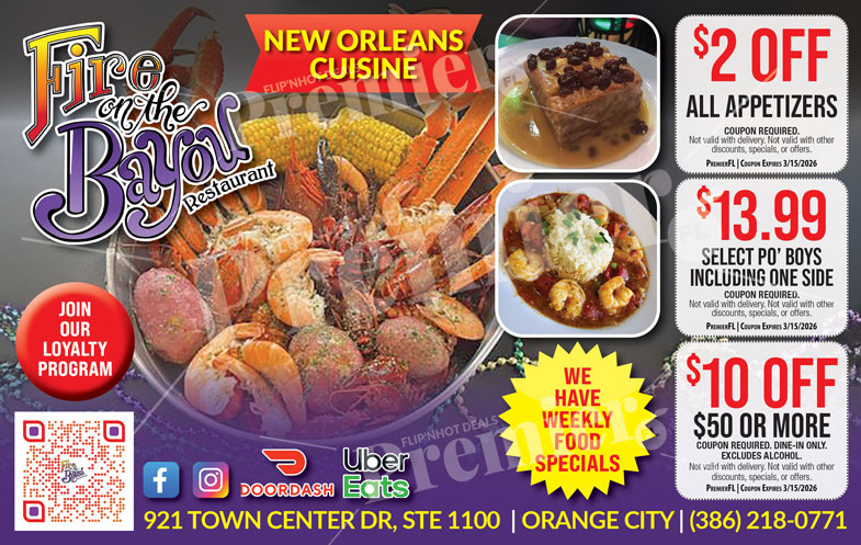 Located in Orange City’s Town Center area, Fire On The Bayou is a go-to destination for casual dining, family meals, and gatherings with friends. With its welcoming vibe and consistent quality, it continues to be a favorite spot for authentic New Orleans-style cuisine in Central Florida.