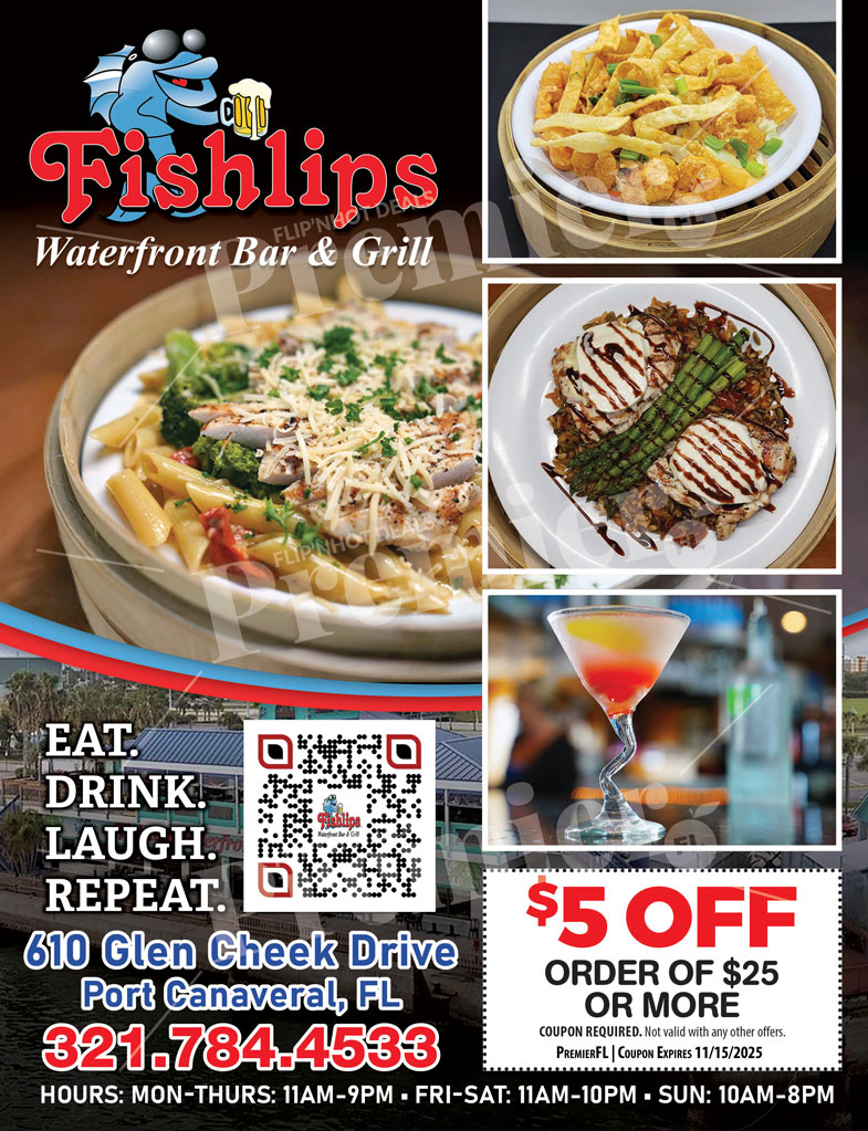 Located right on the water in beautiful Port Canaveral, Fishlips Waterfront Bar & Grill is one of