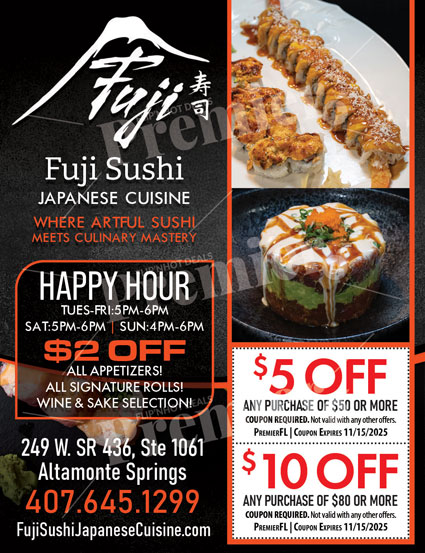 ๐ 249 W SR 436, Suite 1061, Altamonte Springs, FL | ๐ (407) 645-1299 | ๐ FujiSushiJapaneseCuisine.com