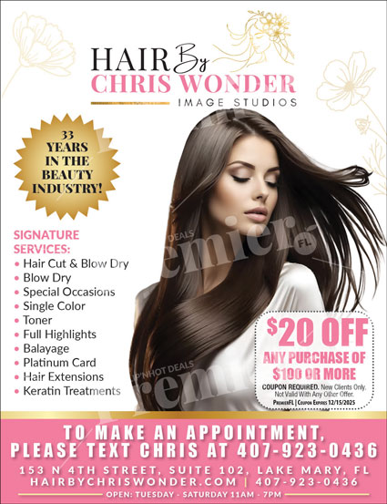 Hair By Chris Wonder is a premier image studio in Lake Mary, Florida, offering professional hair services backed by decades of experience in the beauty industry. Known for personalized consultations and refined techniques, Chris Wonder creates styles that enhance natural beauty while fitting each client’s lifestyle. The salon provides a comfortable, boutique-style environment where quality and attention to detail come first.