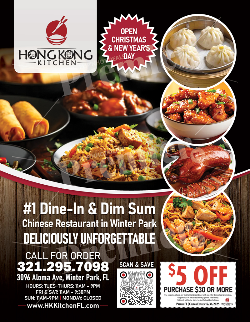 Hong Kong Kitchen is Winter Park’s favorite destination for authentic Chinese food and made-from-scratch Dim Sum. Known for bold flavors, fresh ingredients, and generous portions, every dish is prepared to order and served hot, fast, and full of flavor.