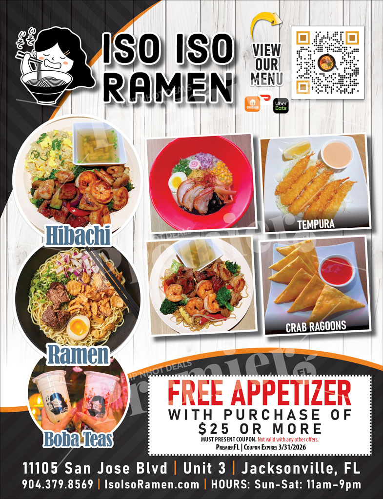 Located on San Jose Boulevard in Jacksonville, Iso Iso Ramen appeals to locals searching for “ramen near me” or a cozy place to enjoy Japanese comfort food. With friendly service and consistently delicious offerings, it’s an ideal destination for both ramen enthusiasts and first-time visitors.