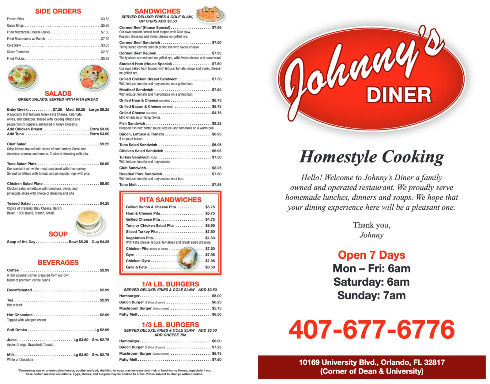 Located at 10169 University Blvd in Orlando, Johnny’s Diner is open Monday through Saturday from 6 AM to 3 PM and Sunday from 7 AM to 3 PM. Whether you’re dining in with family or grabbing a quick bite, Johnny’s delivers comforting meals at great prices.