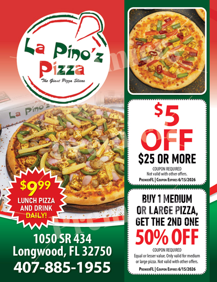 Conveniently located on SR 434 in Longwood, La Pino’z Pizza is a local favorite for dine-in and takeout. If you’re searching for quality pizza in Longwood, FL, La Pino’z delivers flavor, freshness, and friendly service in a welcoming atmosphere.