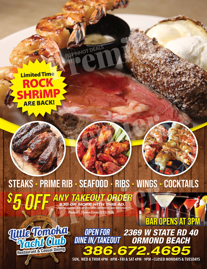 Whether you’re craving a perfectly cooked steak, fresh seafood platter, or signature rock shrimp, Little Tomoka Yacht Club delivers bold flavors and generous portions. Enjoy dine-in service or convenient takeout for a delicious meal at home.
