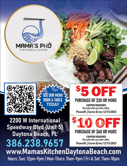 Mamaโs Phแป is a welcoming Vietnamese restaurant in Daytona Beach, Florida, serving traditional dishes rooted in authentic flavors and fresh ingredients. Known for its comforting atmosphere and carefully prepared meals, Mamaโs Phแป is a favorite for locals and visitors craving genuine Vietnamese cuisine made with care.