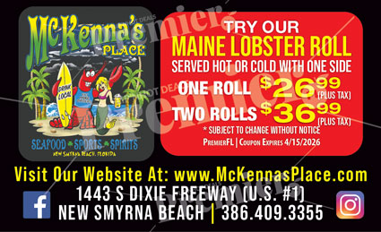 For over 30 years, McKenna’s Place has been a local tradition for great food, friendly service, and unbeatable value. From mouth-watering seafood platters and Maine lobster rolls to burgers, wings, and daily drink specials, every visit is filled with fun, flavor, and Florida spirit.