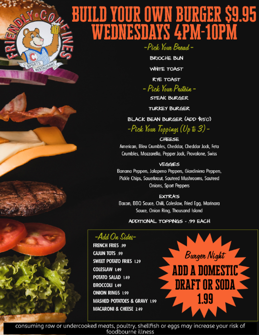 The menu features fan-favorite bar food, wings, burgers, fries, and shareable plates, paired with a full-service bar. With space available for larger parties and group gatherings, My Friendly Confines is ideal for birthdays, team outings, and game-day celebrations.