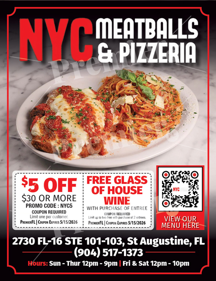 NYC Meatballs & Pizzeria brings classic New York-style Italian flavors to St. Augustine. From handcrafted meatballs and baked pasta dishes to fresh pizza and house wine, this local favorite delivers bold flavor and comforting Italian cuisine in a relaxed setting.