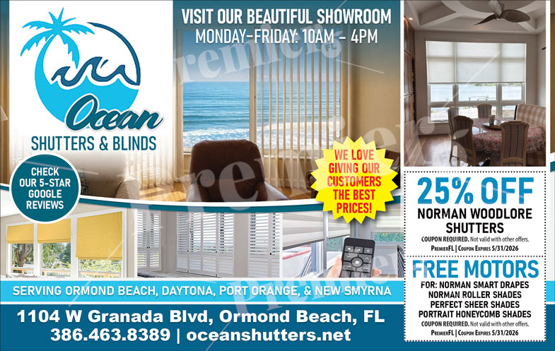Ocean Shutters & Blinds provides high-quality custom window treatments for homes and businesses throughout Ormond Beach, Daytona Beach, Port Orange, and New Smyrna Beach. With a beautiful local showroom and a commitment to exceptional customer service, Ocean Shutters & Blinds helps transform interior spaces with stylish and functional solutions.