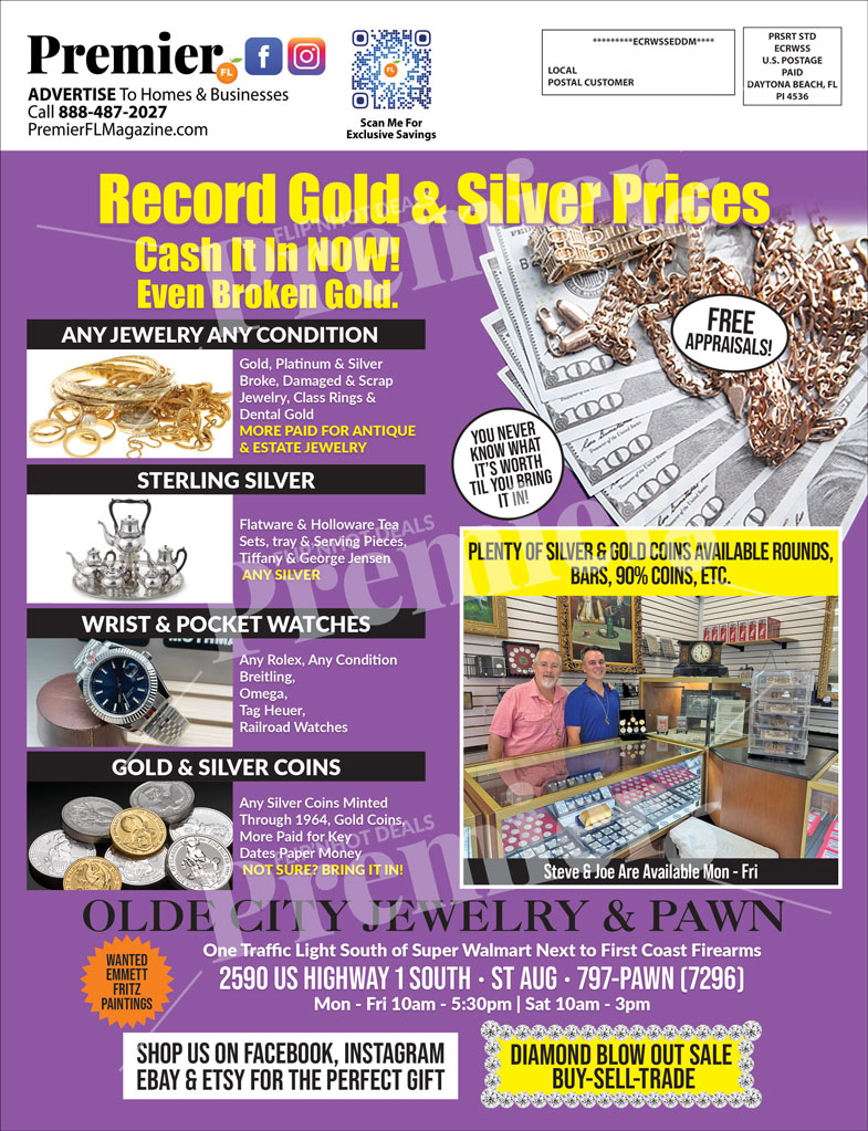 Olde City Jewelry & Pawn is St. Augustine’s trusted destination for buying, selling, and trading fine jewelry, coins, watches, and antiques. Known for honesty and expertise, they provide fair appraisals and top market payouts for gold, silver, and estate pieces — even if they’re broken or worn.