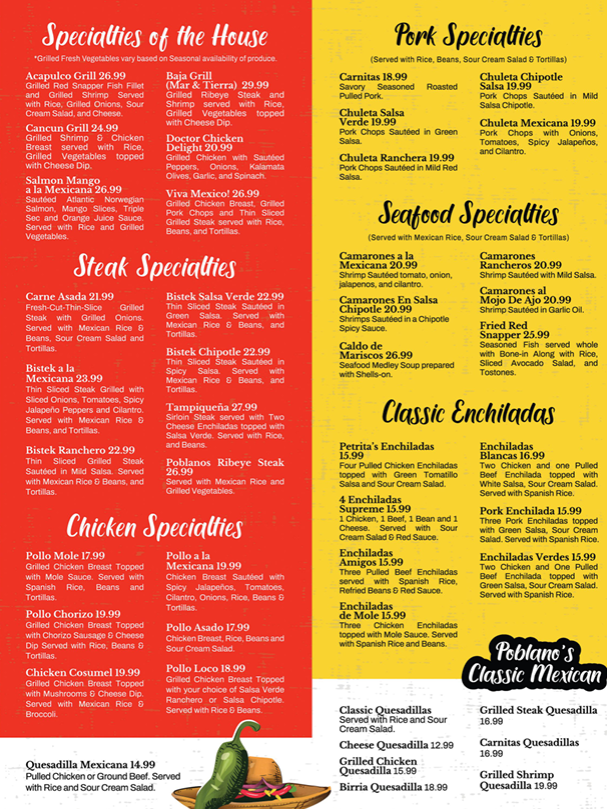 Poblano’s Mexican Grill brings authentic Mexican flavors to Oviedo with freshly prepared dishes, vibrant ingredients, and a welcoming atmosphere. From sizzling fajitas and savory tacos to handcrafted margaritas, Poblano’s offers a true taste of traditional Mexican cuisine.