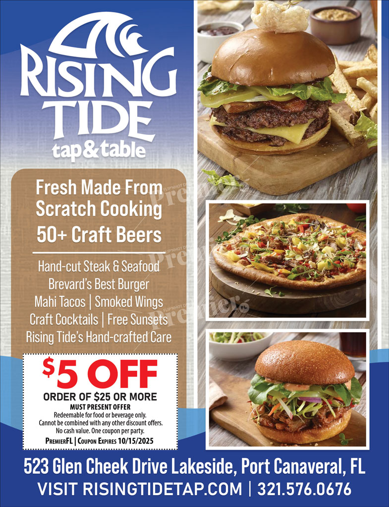 With its open-air design and waterside seating, Rising Tide offers the perfect setting to unwind. Sip a cocktail while watching the sunset over Port Canaveral or gather with friends for a weekend meal filled with laughter and live energy. The restaurantโ€™s friendly staff, local brews, and welcoming atmosphere make it a top dining destination on Floridaโ€™s Space Coast.