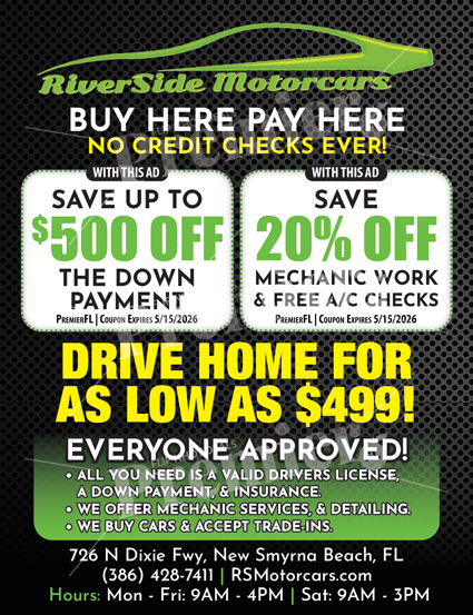 Get behind the wheel fast at Riverside Motorcars in New Smyrna Beach — your local “Buy Here, Pay Here” dealership where everyone is approved! With honest deals, flexible financing, and a wide variety of quality pre-owned cars, it’s never been easier to find your next ride.