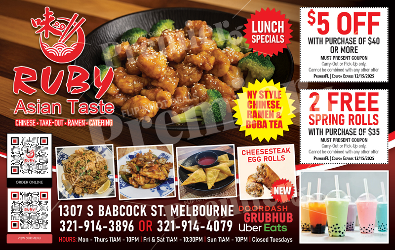 Ruby Asian Taste is a popular Asian restaurant in Melbourne, Florida, offering New York–style Chinese cuisine, flavorful ramen, and refreshing boba tea. Known for generous portions, bold flavors, and quick service, Ruby Asian Taste is a go-to destination for dine-in, takeout, and convenient delivery options.