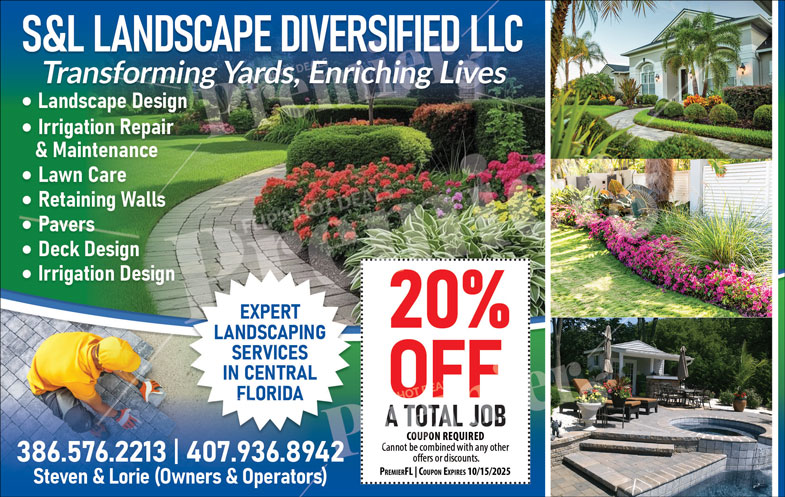 S&L Landscape Diversified LLC is a trusted, family-owned business bringing beauty, functionality, and long-lasting value to residential and commercial landscapes across Central Florida. Owners Steven and Lorie take pride in delivering exceptional quality, personalized service, and designs tailored to each clientโs vision.