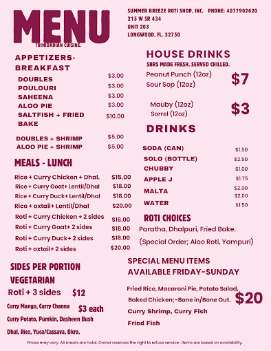 Summer Breeze Roti Shop brings the vibrant flavors of the Caribbean to Longwood with authentic, home-style comfort food made from traditional recipes. Known for bold spices, slow-cooked meats, and freshly prepared roti, Summer Breeze offers a true taste of island cuisine.