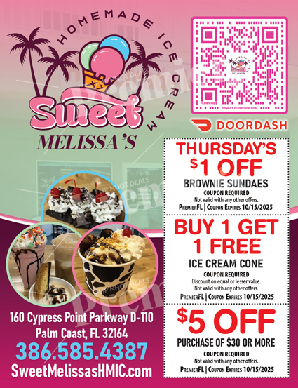Sweet Melissa’s Ice Cream brings the fun and flavor back to Palm Coast with handcrafted desserts that are made fresh daily. From brownie sundaes and creamy cones to milkshakes piled high with toppings, every treat is made with love and local flair.