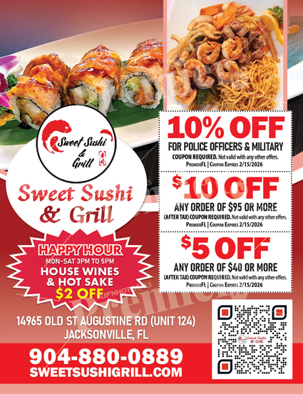Sweet Sushi & Grill is a welcoming Japanese and Asian-inspired restaurant in Jacksonville, Florida, offering a balanced menu of fresh sushi, grilled entrées, and classic favorites. Known for its relaxed atmosphere and flavorful dishes, Sweet Sushi & Grill appeals to diners looking for quality ingredients, generous portions, and a comfortable dining experience.
