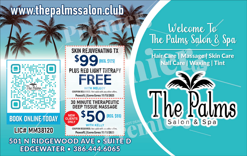 The Palms Salon & Spa offers beauty and wellness services like hair styling, facials, body treatments, and massages. Their aim is to provide pampering, relaxation, and aesthetic enhancements.