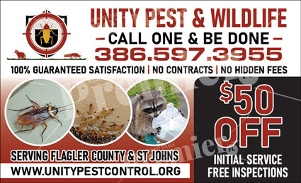 Unity Pest & Wildlife provides fast, reliable pest control and wildlife removal throughout Flagler and St. Johns Counties. Their team is committed to 100% guaranteed satisfaction — with no contracts, no hidden fees, and honest, up-front pricing every time.