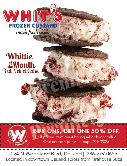 Conveniently located on Woodland Boulevard in downtown DeLand, Whit’s Frozen Custard is a go-to stop after dinner, during a stroll, or for a special dessert run. With friendly service and consistently fresh custard, it’s a local favorite for families, students, and visitors alike.