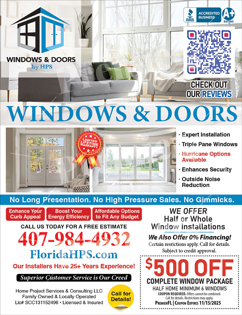 Windows & Doors by HPS provides Central Florida homeowners with professional window and door solutions designed for beauty, energy efficiency, and security. Locally owned and operated, HPS has built its reputation on honesty, expert craftsmanship, and personalized service โ without the gimmicks or high-pressure sales tactics that other companies rely on.